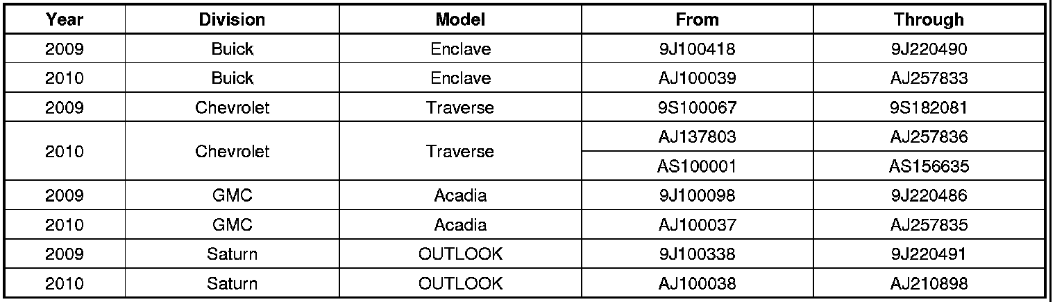 Involved are certain 2009-2010 model year Buick Enclave, Chevrolet Traverse, GMC Acadia, and Saturn Outlook vehicles built within these VIN breakpoints: