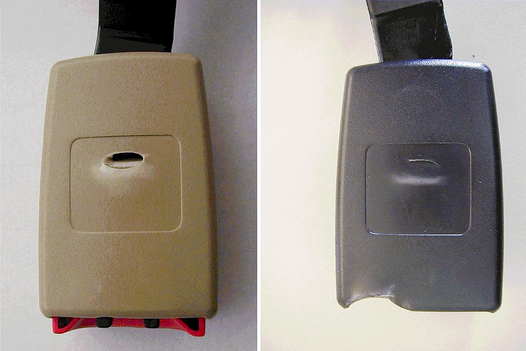 - If evidence of buckle damage such as a bent or cracked plastic housing is found, or if stressed witness marks are visible on the housing, replace the seat belt buckle. Refer to Rear Seat Belt Buckle Replacement in SI, and then continue on and complete the trim cover rework procedure below.