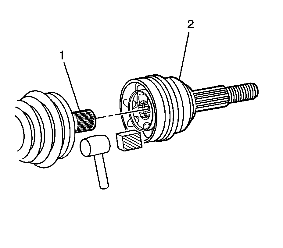 6. Using a block of wood and a hammer, remove the CV joint (2) from the wheel drive shaft (1).