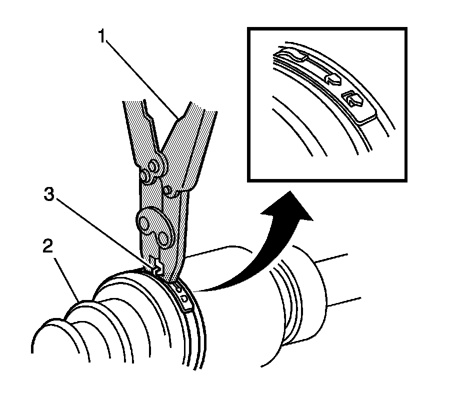7. Using the J 35910 - Drive Axle Seal Clamp Pliers , tighten the boot clamp (2) until the gap (3) in the boot clamp measure 1.9 mm (0.07 in).