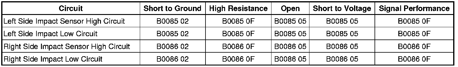 The inflatable restraint side impact sensor utilizes a unidirectional 2-wire circuit. The side impact sensor modulates current on the interface to send ID, state of health, and deployment commands to the inflatable restraint sensing and diagnostic module (SDM). The SDM serves as a power source and a ground for the side impact sensor. When the ignition is turned ON and input power from the SDM is first detected, the side impact sensor responds by performing internal diagnostics and sending an ID to the SDM. The SDM considers the ID to be valid if the response time is less than 5 seconds. The side impact sensor continually communicates status messages to the SDM, which determines if a fault is present in the side impact sensor circuit. When a fault is detected, the SDM may reset the side impact sensor up to 2 times by removing and reapplying power to it. If the fault is still present, the SDM will set a DTC.