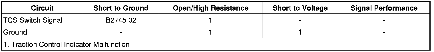 The driver may disable the Traction Control System (TCS) by pressing the traction control switch. The body control module (BCM) detects the signal circuit is grounded and sends a serial data message to the EBCM to disable traction control, and the IPC to illuminate the indicator.