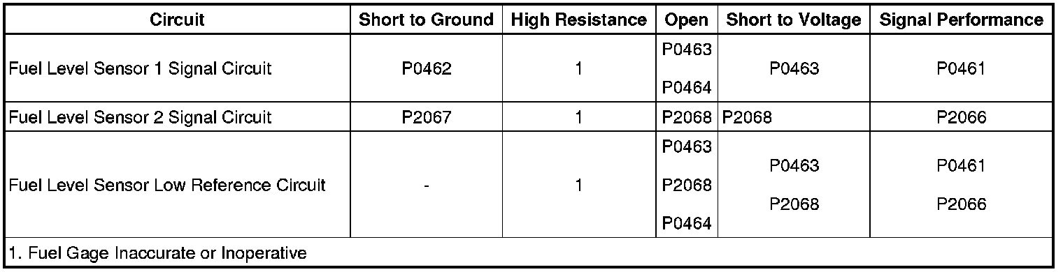 The primary fuel level sender and the secondary fuel level sender changes resistance based on fuel level. The engine control module (ECM) monitors the signal circuits of the primary fuel level sender and the secondary fuel level sender in order to determine the fuel level. When the fuel tank is full, the resistances of both fuel level senders are low and the ECM senses a low signal voltage on both the signal circuits of the primary fuel level sender and the secondary fuel level sender. When the fuel tanks are empty, the resistances of the fuel level senders are high and the ECM senses a high signal voltage. The ECM uses the signal circuits of the primary fuel level sender and the secondary fuel level sender in order to calculate the percentage of remaining fuel in the tank. The ECM sends the fuel level percentage via serial data circuit to the instrument cluster in order to control the fuel gage.