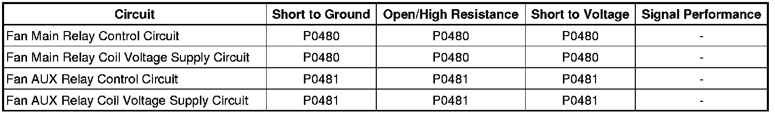 The engine control module (ECM) grounds the fan AUX relay and the fan main relay control circuits through an internal solid state device called a driver. The primary function of the driver is to supply the ground for the component being controlled. Each driver has a fault line that is monitored by the ECM. When the ECM is commanding a component ON, the voltage potential of the control circuit should be low, near 0 volts. When the ECM is commanding the control circuit to a component OFF, the voltage potential of the circuit should be high, near battery voltage. If the ECM detects that the actual state of the control circuit does not match the expected state, a DTC will set.