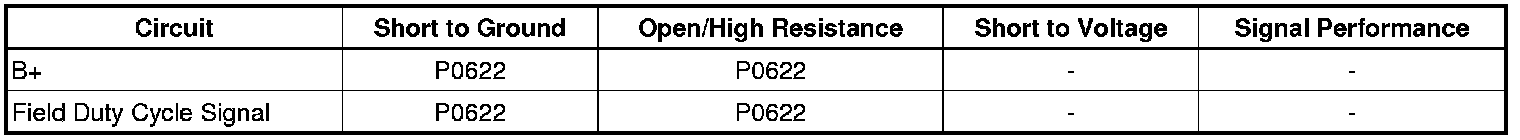 The engine control module (ECM) uses the generator field duty cycle signal circuit, or the F-Terminal circuit, to monitor the duty cycle of the generator. The generator field duty cycle signal circuit connects to high side of the field windings in the generator. A pulse width modulated (PWM) high side driver in the voltage regulator turns the field windings ON and OFF. The ECM uses the PWM signal input to determine the generator load on the engine. This allows the ECM to adjust the idle speed to compensate for high electrical loads. The ECM monitors the status of the generator field duty cycle signal circuit. When the ignition is ON and the engine is OFF, the ECM should detect a duty cycle near 0 percent. When the engine is running, the duty cycle should be between 5-99 percent.