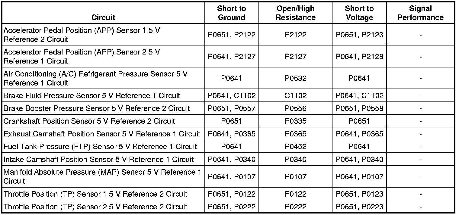The engine control module (ECM) has 2 internal 5 V reference busses called 5 V reference 1 and 5 V reference 2. Each reference buss provides 5 V reference circuits for more than one sensor. A fault condition on one 5 V reference circuit will affect the other 5 V reference circuits connected to that reference buss. The ECM monitors the voltage on the 5 V reference buss.