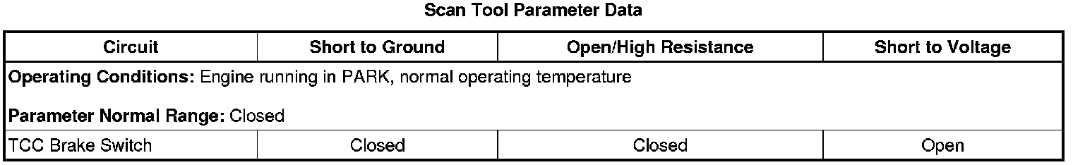 1. Install a scan tool. Turn ON the ignition, leaving the engine OFF. Observe the TCC Brake Switch parameter. The parameter should display Closed.