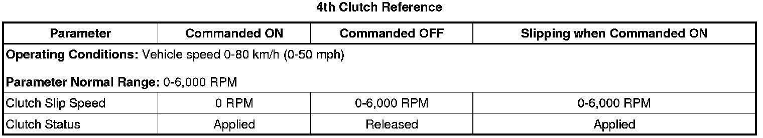 5. Operate the vehicle from 3rd through 4th gear while observing the Clutch 4 Slip Speed parameter. Stop the vehicle and turn the ignition OFF for 30 seconds. Perform this action 2 times. The Clutch 4 Slip Speed parameter should display 0 RPM when the Clutch 4 Status parameter displays Applied.