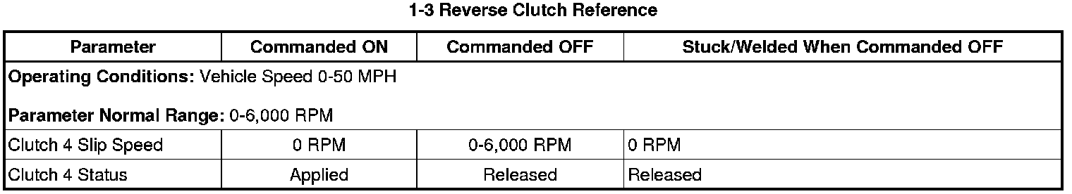 The 1-3 reverse clutch is commanded OFF for 3 seconds and the HPCM detects the 1-3 clutch slip speed is less than 100 RPM for 0.25 seconds, when commanded OFF in EVT 1 mode.