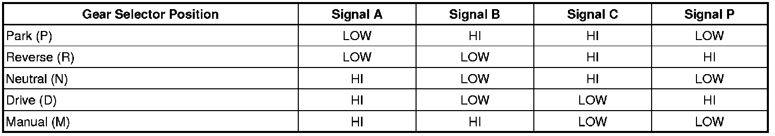 The automatic transmission manual shift shaft position switch assembly, also called the internal mode switch (IMS) assembly, is a dual sliding contact switch attached to the control valve body within the transmission. The 9 outputs from the switch indicate which position is selected by the transmission manual shaft. Four outputs (A, B, C, P) are range selection inputs to the transmission control module (TCM). Five outputs (R1, R2, D1, D2, S) are direction selection inputs to the hybrid powertrain control module (HPCM). The input voltage at the modules is high when the switch is open and low when the switch is closed to ground. The state of each input is displayed on the scan tool as IMS Range and IMS Direction. The IMS Range input parameters represented are transmission range signal A, signal B, signal C, and signal P. The IMS Direction input parameters represented are transmission direction signal R1, signal R2, signal D1, signal D2, and signal Start.