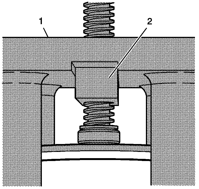 3. Insert the 4 attachment bolts into the legs of the EN 45680-881 fixture (1). Do not apply downward pressure to the cylinder bore sleeve (2). Tighten the 4 attachment bolts to 15 Nm (11 lb ft).