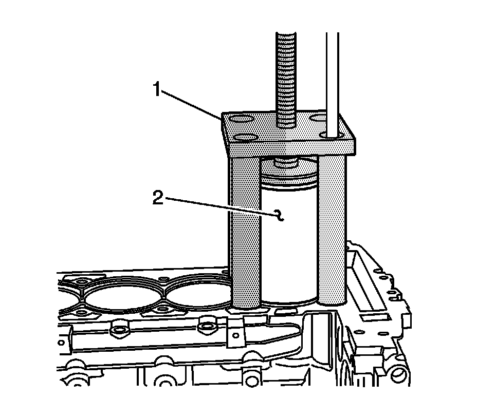 10. Remove the EN 45680-881 fixture and EN 45680-883 cylinder bore sleeve installer assembly (1) from the cylinder block (2).