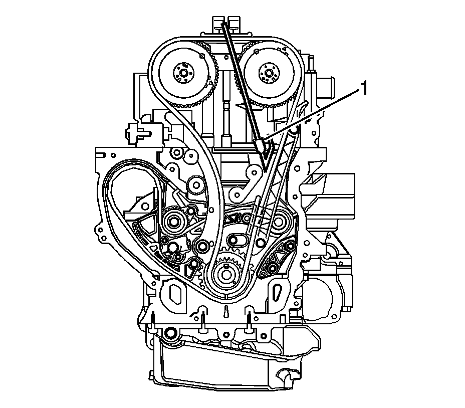 21. Install the timing chain retention tool EN-48749 (1) to the exhaust side of the timing chain.