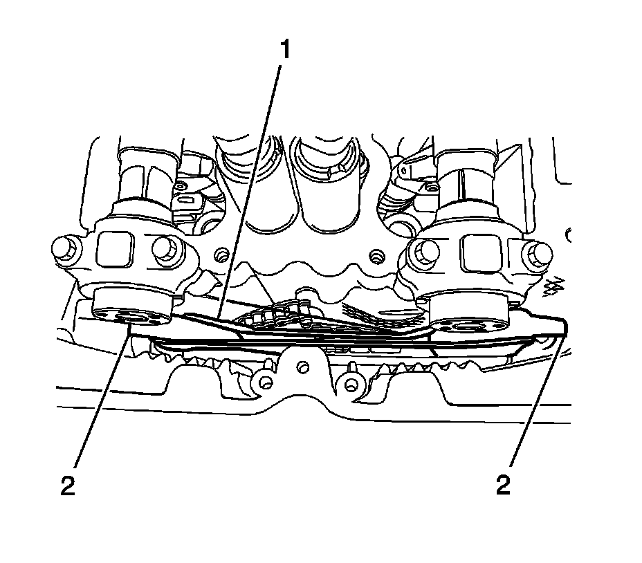 29. Install a rubber band (1) around the top of the upper timing chain guides (2) in order to pull the guides together.