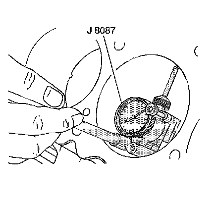 14. Inspect the crankshaft main bearing bores. Use the J 8087 - gage to measure the bearing bore concentricity and alignment. Refer to Engine Mechanical Specifications (Specifications).