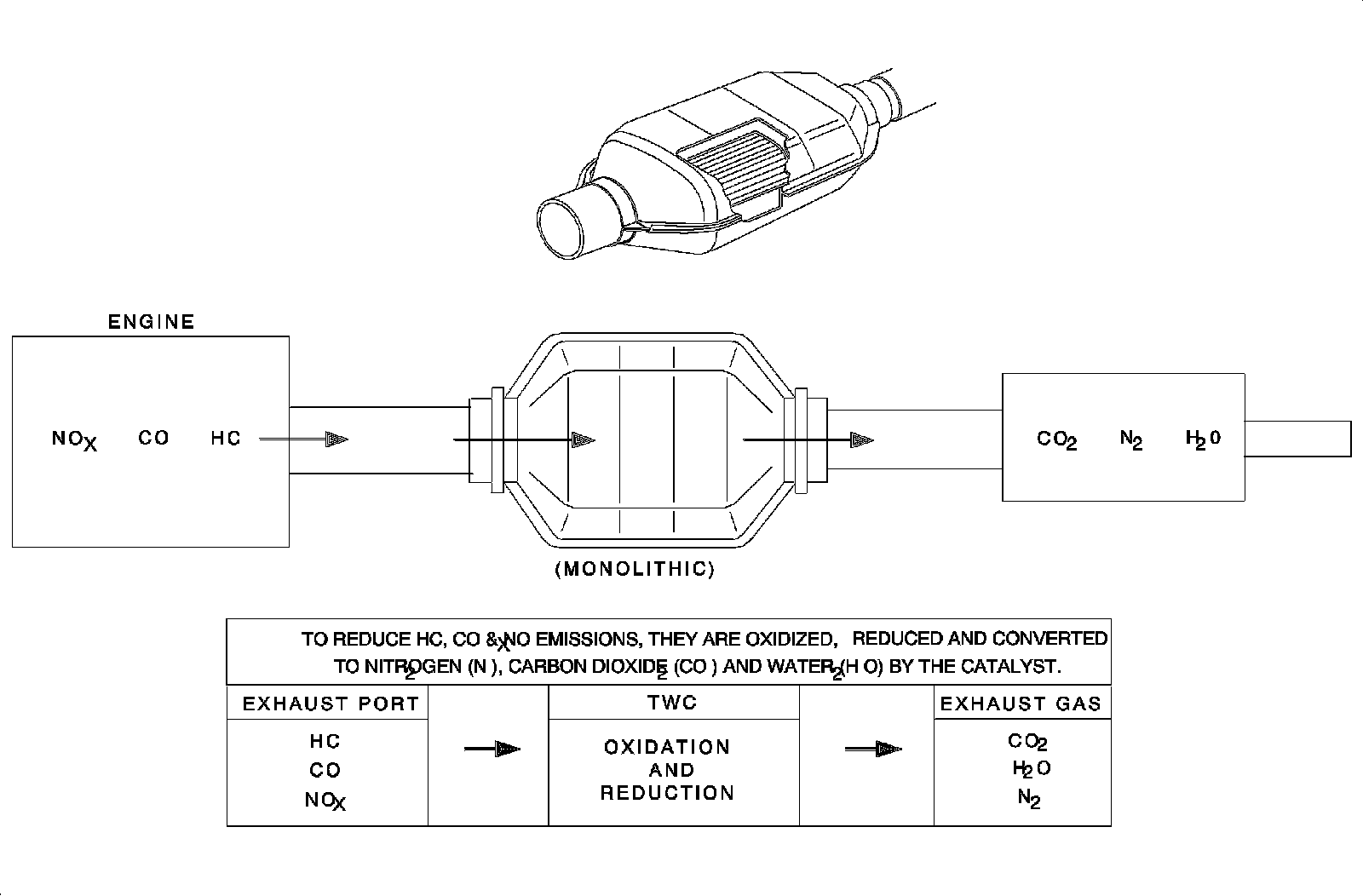 The 3-way catalytic converter is an emission control device added to the exhaust system to reduce pollutants in the exhaust gas stream and requires the use of unleaded fuel only.