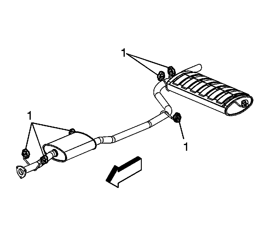 3. With the aid of an assistant, remove the muffler insulators (1) from the hangers.