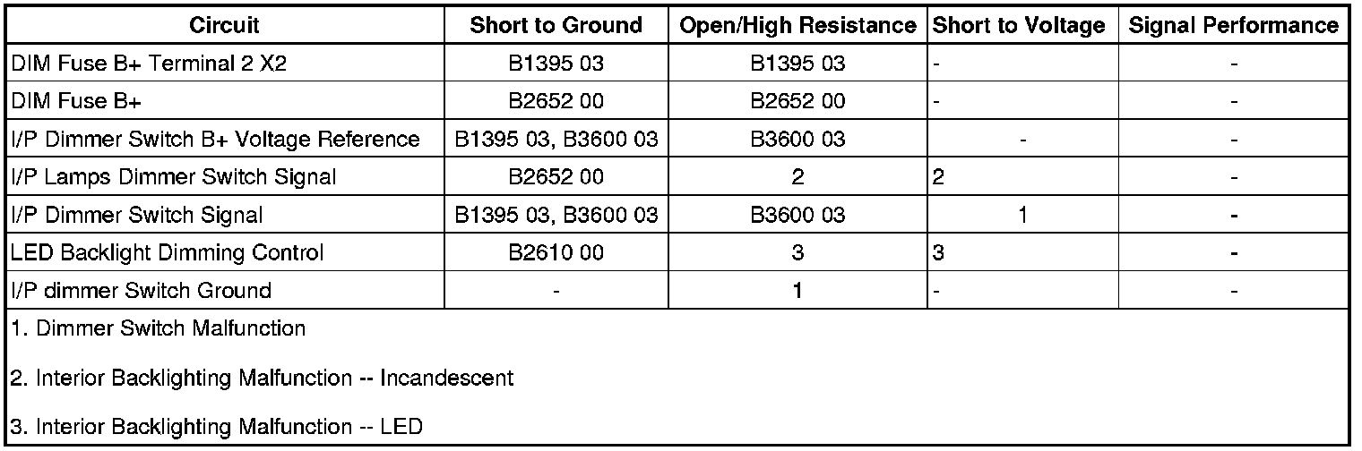 The instrument panel (I/P) lamp dimmer switch is used to increase and decrease the brightness of the interior backlighting components. The I/P dimmer switch provides a voltage signal that will increase as the brightness of the lights are increased and decrease as the brightness of the lights are decreased. The body control module (BCM) provides a B+ voltage reference to the I/P dimmer switch. When the I/P dimmer switch is placed in the desired position, the dimmed voltage setting is applied from the I/P dimmer switch through the I/P dimmer switch signal circuit to the BCM. The BCM interprets the signal and applies the dimmed voltage to the I/P lamps supply voltage circuit and the interior backlighting components dim to the requested level. Ground for the I/P dimmer switch is provided at G201.