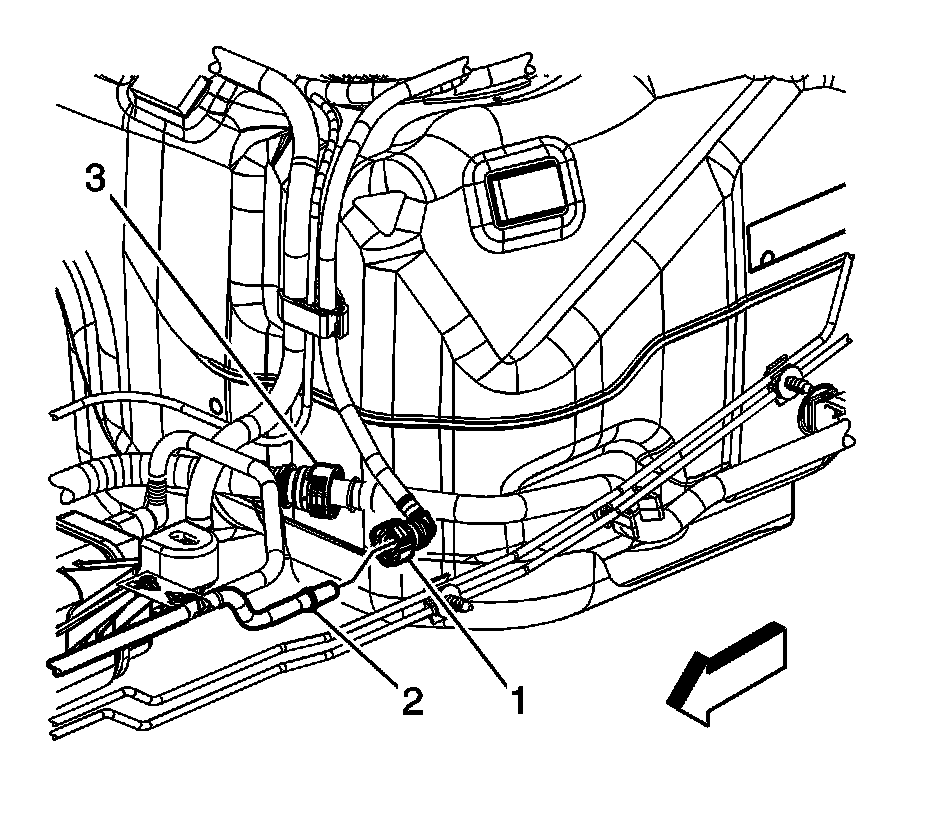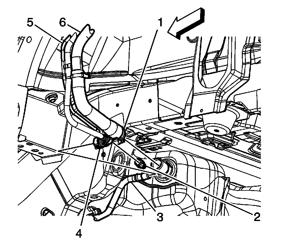 6. Remove the vapor line (5) from the retaining clip (4) and the retaining features (3) molded into the fuel tank.