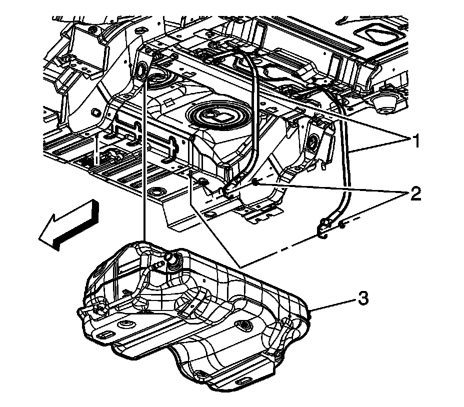 16. Using the adjustable jack, slowly lower and reposition the fuel tank (3) in order to remove the tank from the vehicle. Using the adjustable jack, slowly lower the front of the fuel tank. Pull the fuel tank forward to clear the rear drive module (RDM) and remove the fuel tank assembly with shield from the vehicle.
