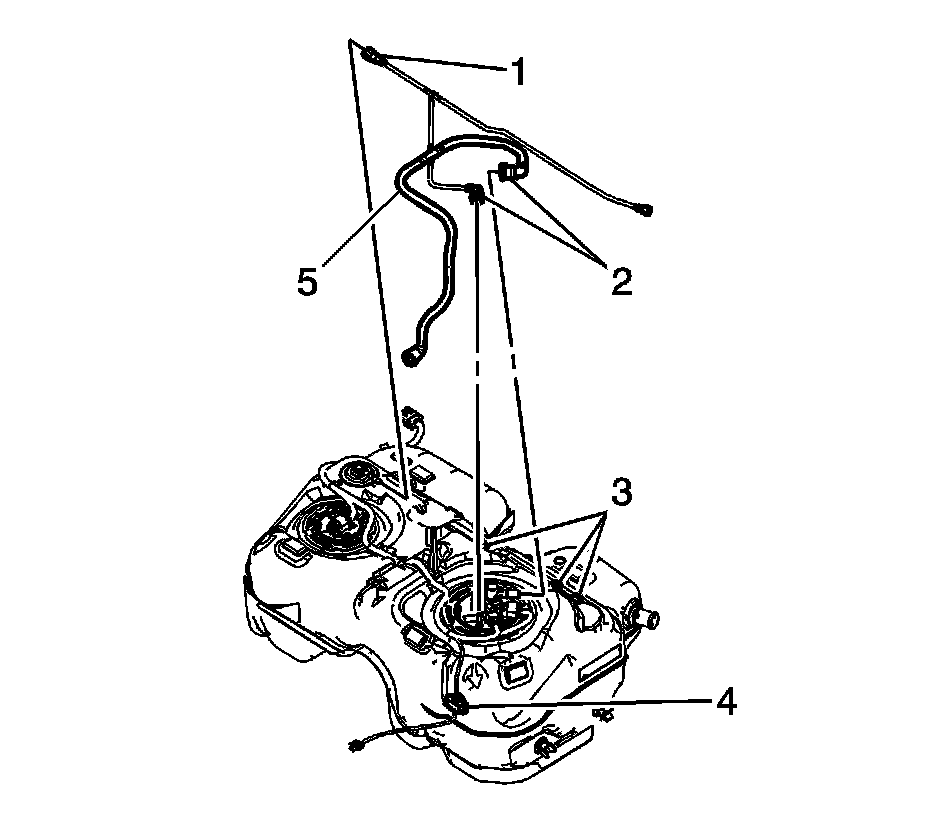 5. Lay the vapor line (5) into position and connect the vapor line quick connect fittings (2) to the fuel tank fuel pump module. Refer to Plastic Collar Quick Connect Fitting Service (Plastic Collar Quick Connect Fitting Service).