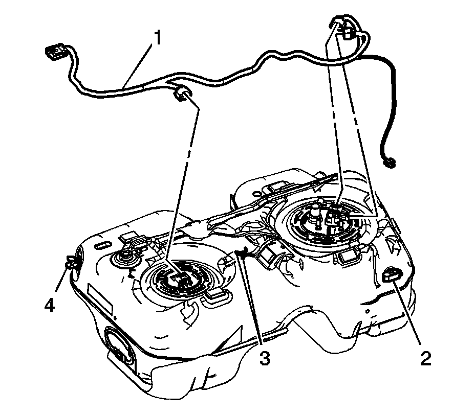 4. Install the fuel tank wiring harness to the retaining clips (2 and 4) and the retaining features (3) molded into the fuel tank.