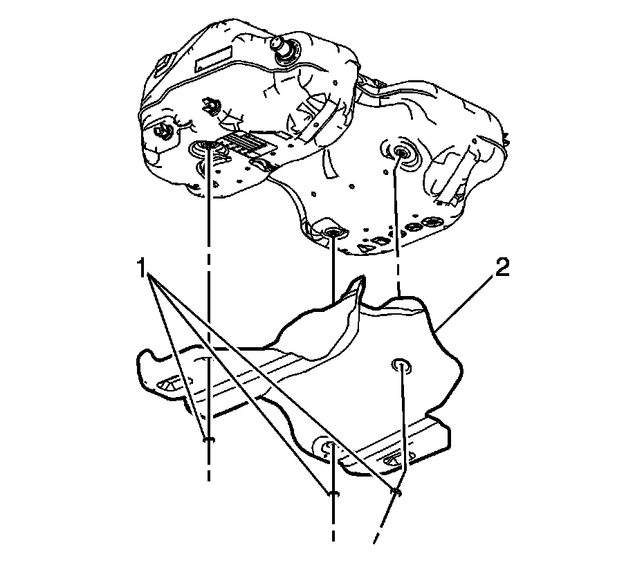 9. Remove the fuel tank shield retainers (1) and shield (2).