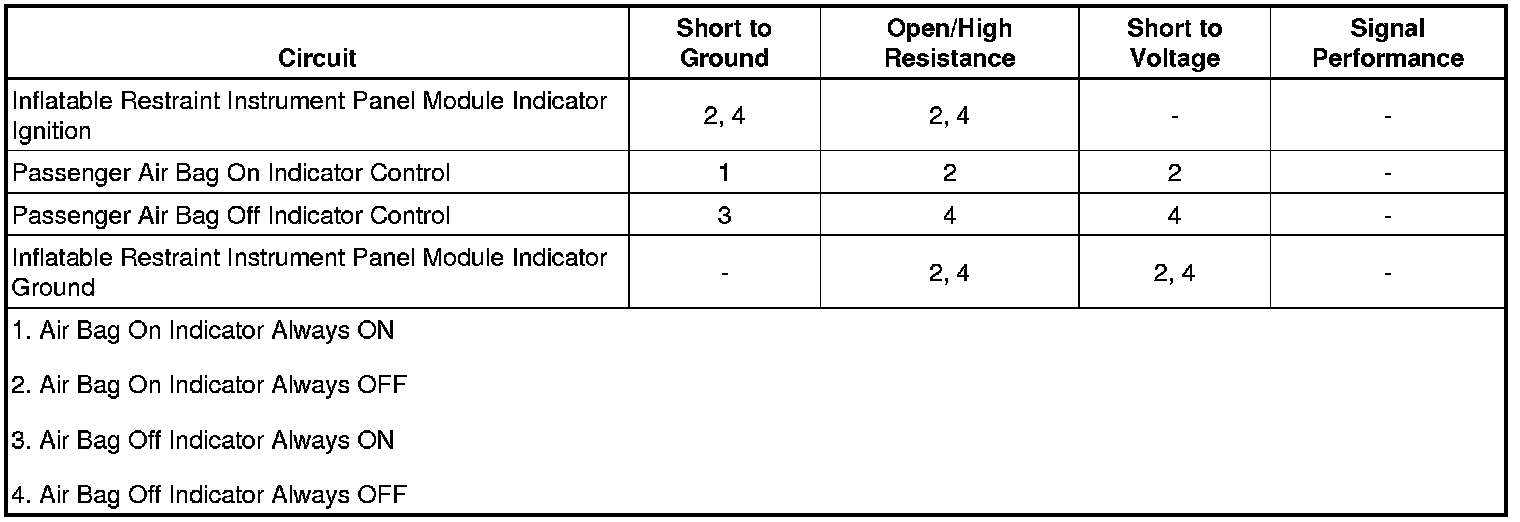 The PASSENGER AIR BAG ON/OFF indicators are used to notify the driver when the Passenger Presence System (PPS) has enabled or disabled the I/P inflator module. When the ignition is turned ON, the PPS illuminates the PASSENGER AIR BAG ON/OFF indicators for 5 seconds. The PPS module conducts tests on the PPS components and circuits while the PASSENGER AIR BAG ON/OFF indicators are illuminated. If no malfunctions are detected, the PPS module will illuminate the PASSENGER AIR BAG indicator ON or OFF, depending on the status of the PPS. If a malfunction is detected, the PPS module will store a diagnostic trouble code (DTC), default the PPS to the OFF state, and communicate with the SDM that a DTC has been set. The SDM will request the IPC to illuminate the AIR BAG indicator to notify the driver of a PPS malfunction.