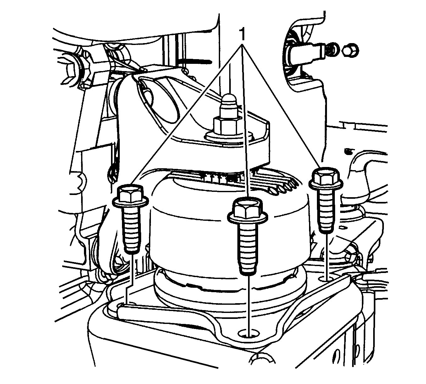 16.Remove the three front transmission mount retaining bolts (1) from the frame.
