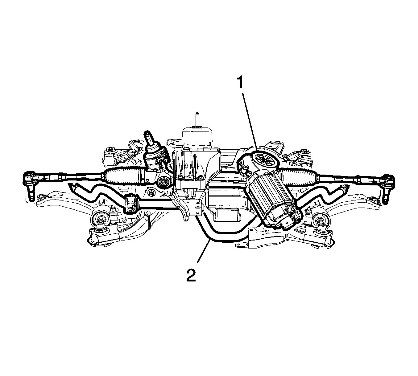 23.Raise the vehicle off of the frame with the power steering rack (1) and stabilizer bar still attached the frame.