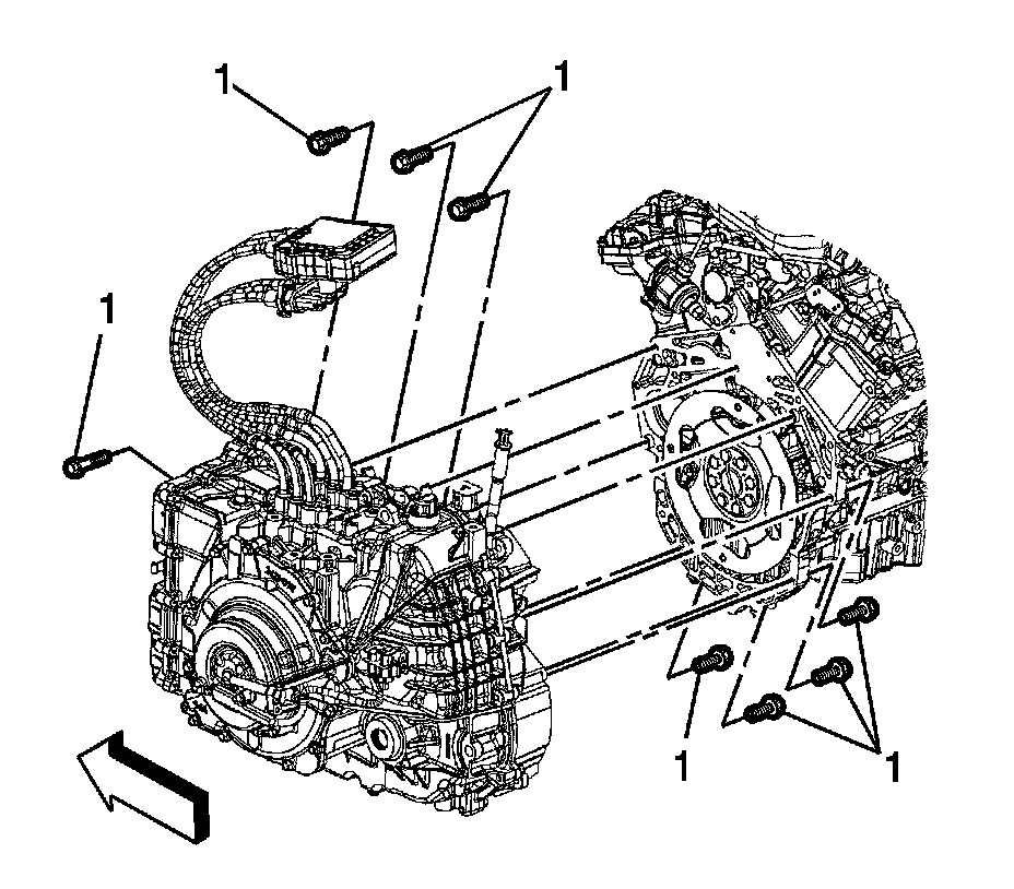 3. Install the eight transaxle to engine retaining bolts (1), then tighten the bolts to 80 Nm (60 lb ft).