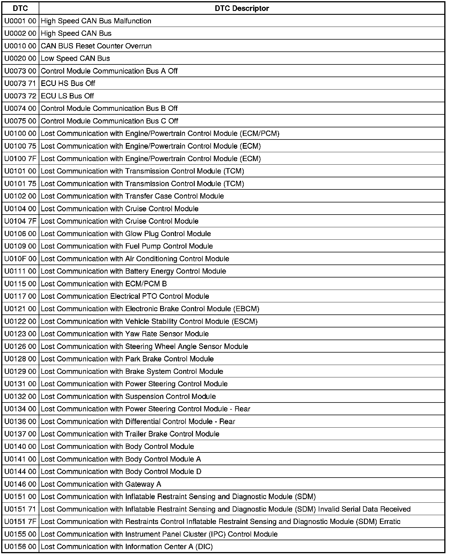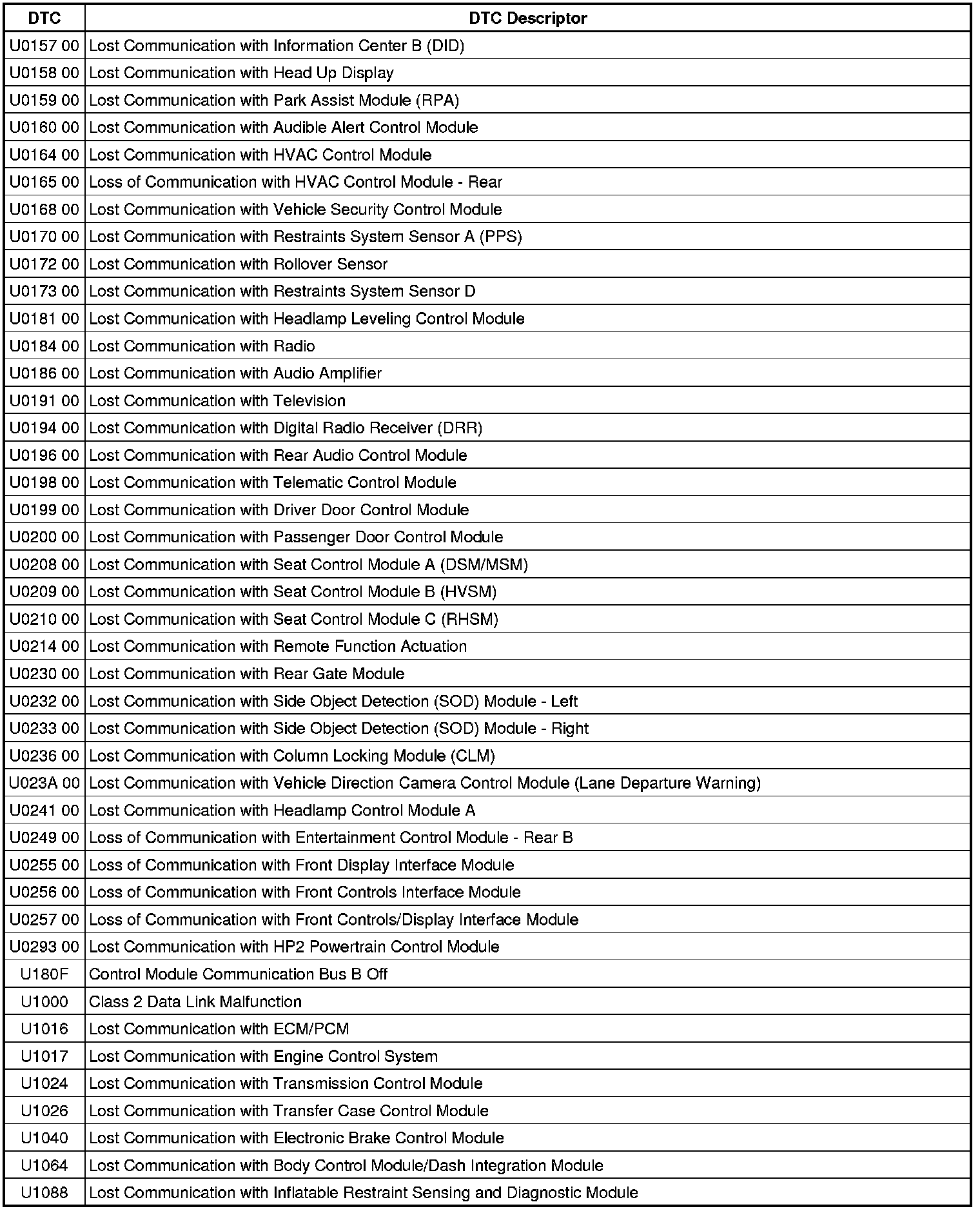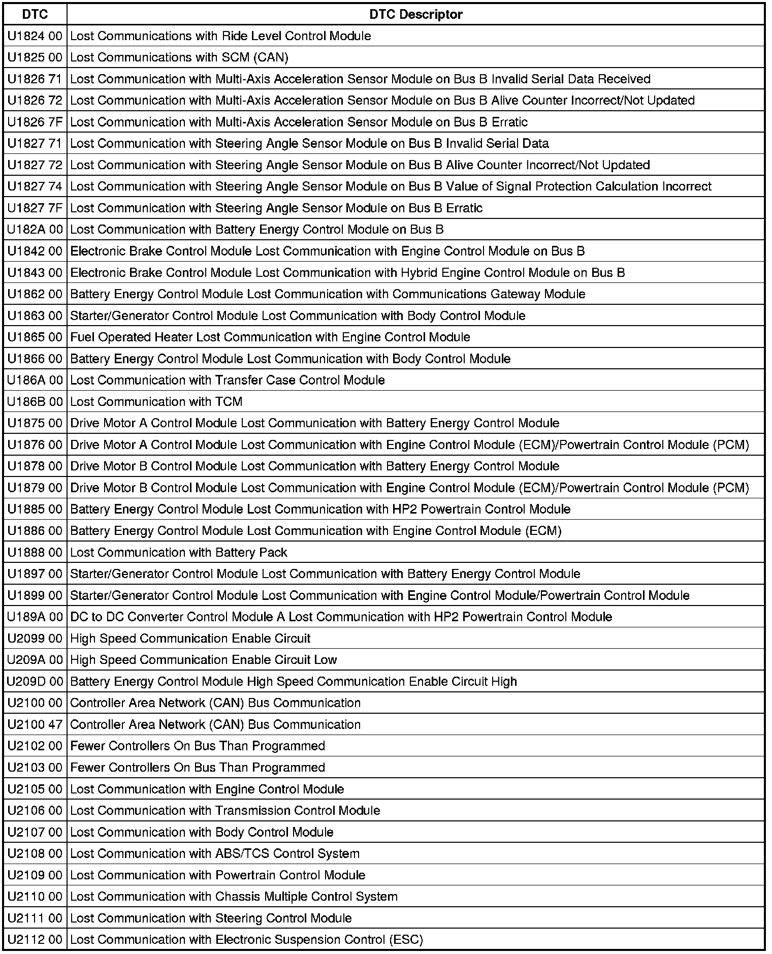 This list includes all Data Communications related U-code DTCs in alphanumeric order with descriptors for all modules. Not all DTCs listed will be applicable to all vehicles.