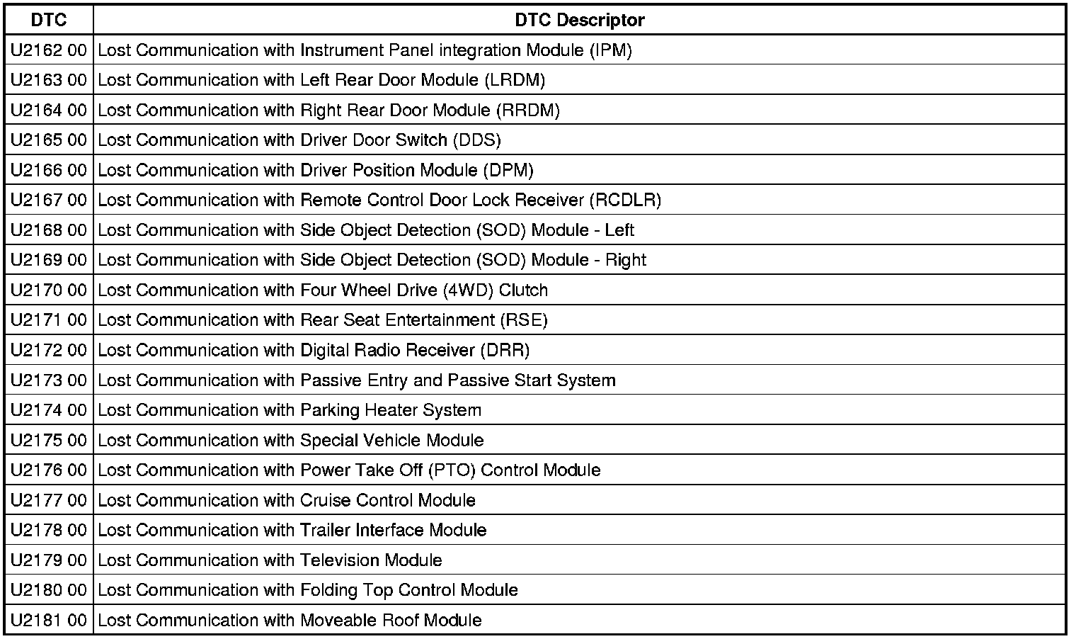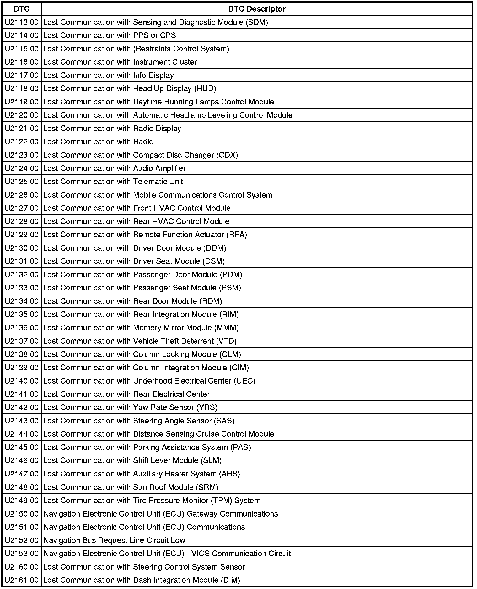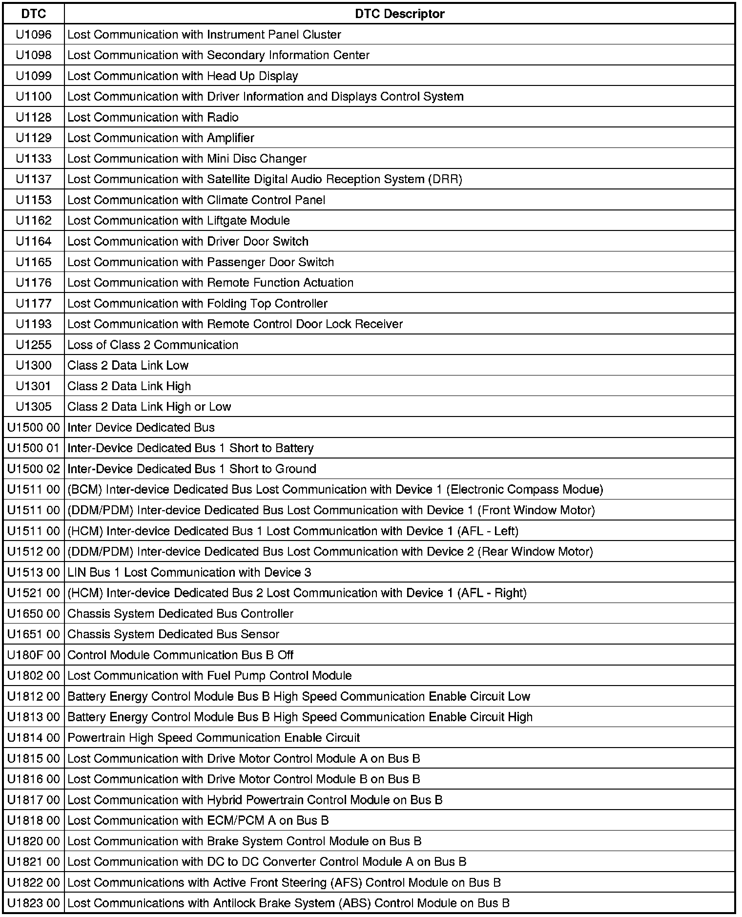 This list includes all Data Communications related U-code DTCs in alphanumeric order with descriptors for all modules. Not all DTCs listed will be applicable to all vehicles.