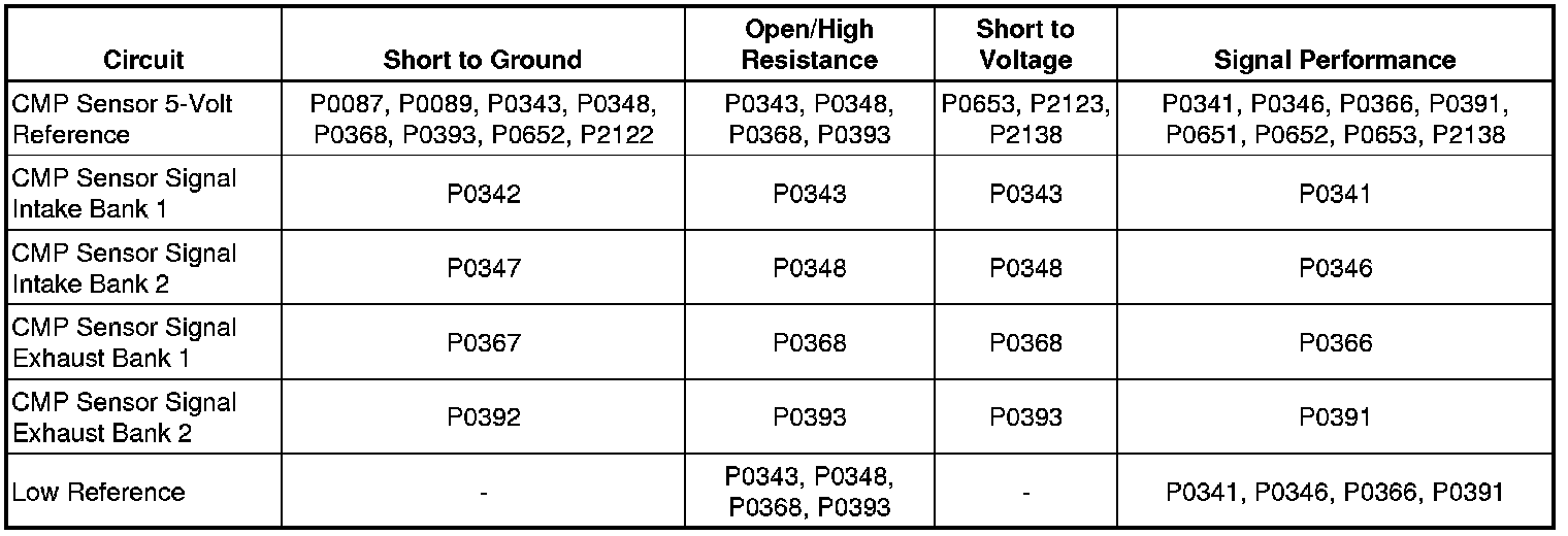 Each camshaft is equipped with a camshaft position (CMP) sensor that the engine control module (ECM) monitors. The CMP sensor is a hall effect switch that works in conjunction with a 4X reluctor wheel. The reluctor wheels are mounted to the camshaft position actuators that are mounted to the end of the camshafts. The ECM uses the CMP sensor signals in order to determine the position of the camshafts. The ECM supplies 5 volts to the CMP sensors on the 5-volt reference circuits, and supplies a ground on the low reference circuits. The CMP sensors provide a signal to the ECM on the signal circuits. If the ECM detects extra or missing CMP sensor signal transitions, or a signal voltage that is more or less than the predetermined range, within a certain number of crankshaft revolutions, one of these DTCs sets.
