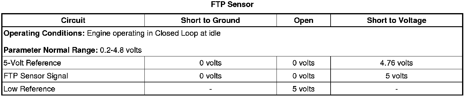 The evaporative emission (EVAP) system is used to store fuel vapors in order to reduce the amount of fuel vapors into the atmosphere. The fuel tank pressure (FTP) sensor is used for EVAP system diagnostics. The FTP sensor is a transducer that varies resistance according to changes in the fuel tank pressure. The engine control module (ECM) monitors the FTP sensor signal in order to detect vacuum decay and excess vacuum during the EVAP system diagnostic test. The ECM supplies a 5-volt reference and a low reference circuit to the FTP sensor.