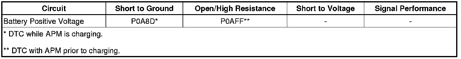 The accessory power module (APM) monitors its 14V circuit when it is enabled for Normal mode or Jump Assist. It requires a minimum voltage on this circuit in order to begin operation. This DTC sets when the 14V circuit in the APM is below this minimum level at the time it is enabled. APM functions will run only when an APM enable message from the hybrid powertrain control module (HPCM) is active on the high speed hybrid GMLAN communication circuit.