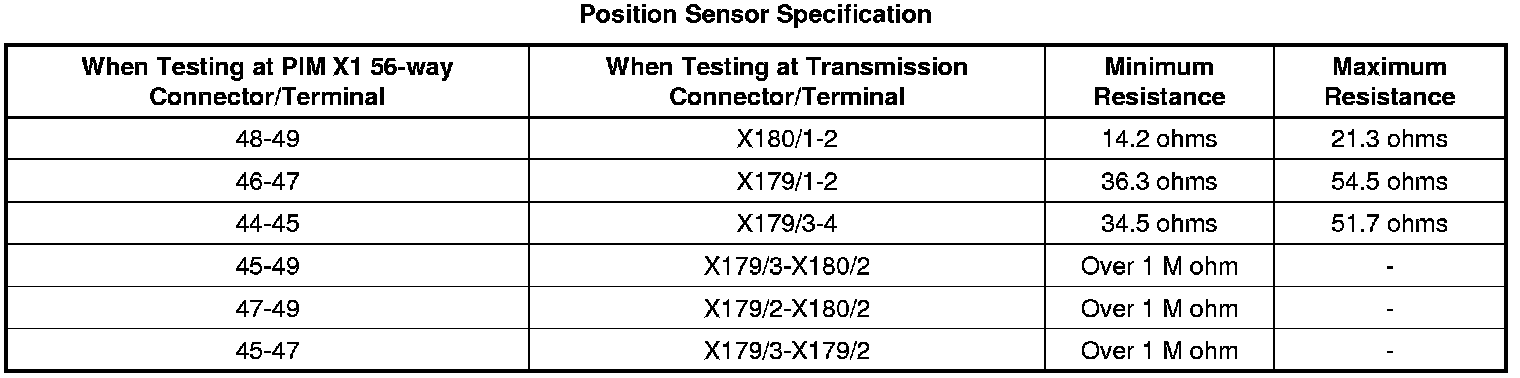 5. Using the Position Sensor Specification table specifications listed below, test the position sensor resistance at the transmission X176 circuits as indicated. Also test each circuit for a short to ground.