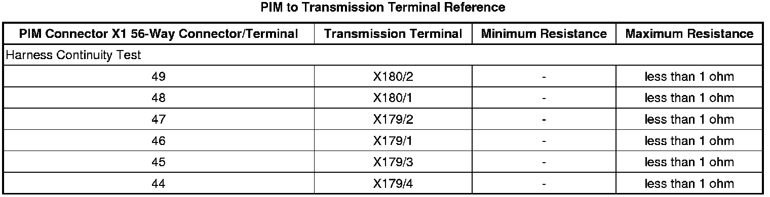 9. Using the PIM to Transmission Terminal Reference table listed below, test the vehicle harness continuity between PIM X1 and transmission X176. Also test these circuits for short to ground and to the shield circuit if the shield circuit is not presently grounded to the PIM assembly.