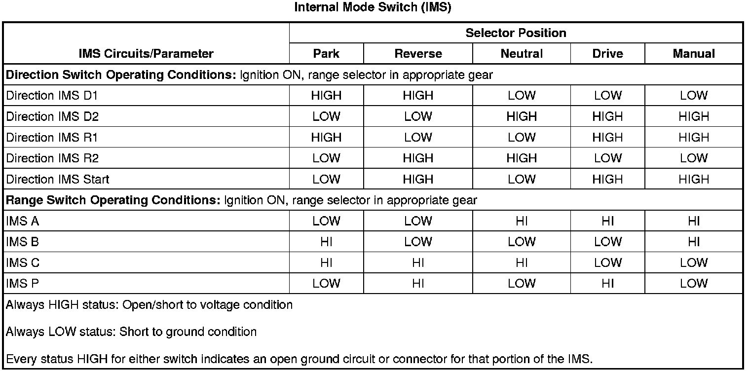 The internal mode switch (IMS) assembly is a sliding contact switch attached to the control valve body within the transmission. The nine outputs from the switch indicate which position is selected by the transmission manual shaft. Four outputs (A, B, C, P), are range selection inputs to the transmission control module (TCM). Five outputs (R1, R2, D1, D2, S) are direction selection inputs to the hybrid powertrain control module (HPCM). The input voltage at the module is high when the switch is open and low when the switch is closed to ground.