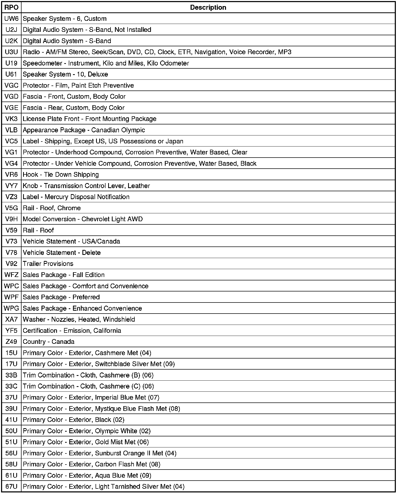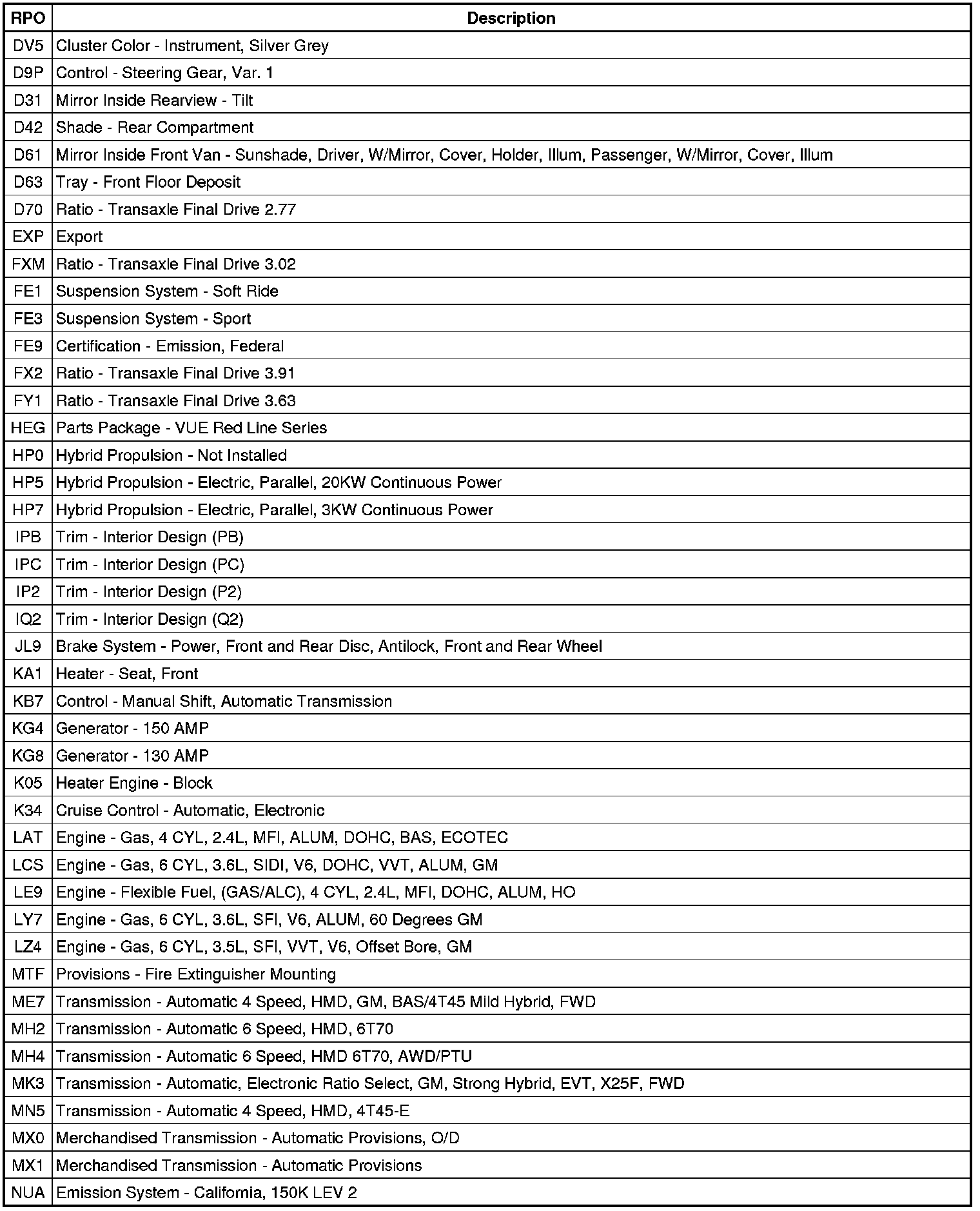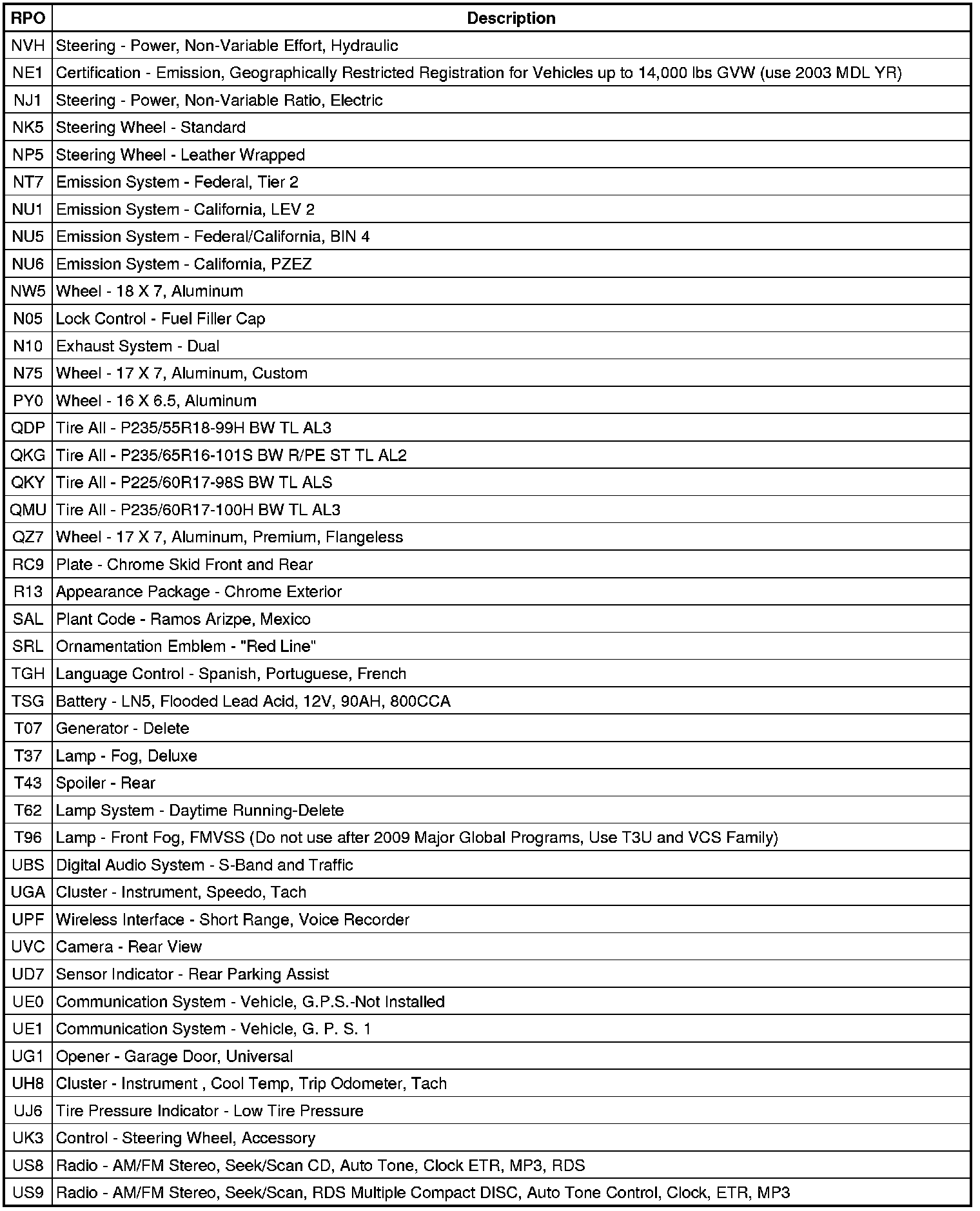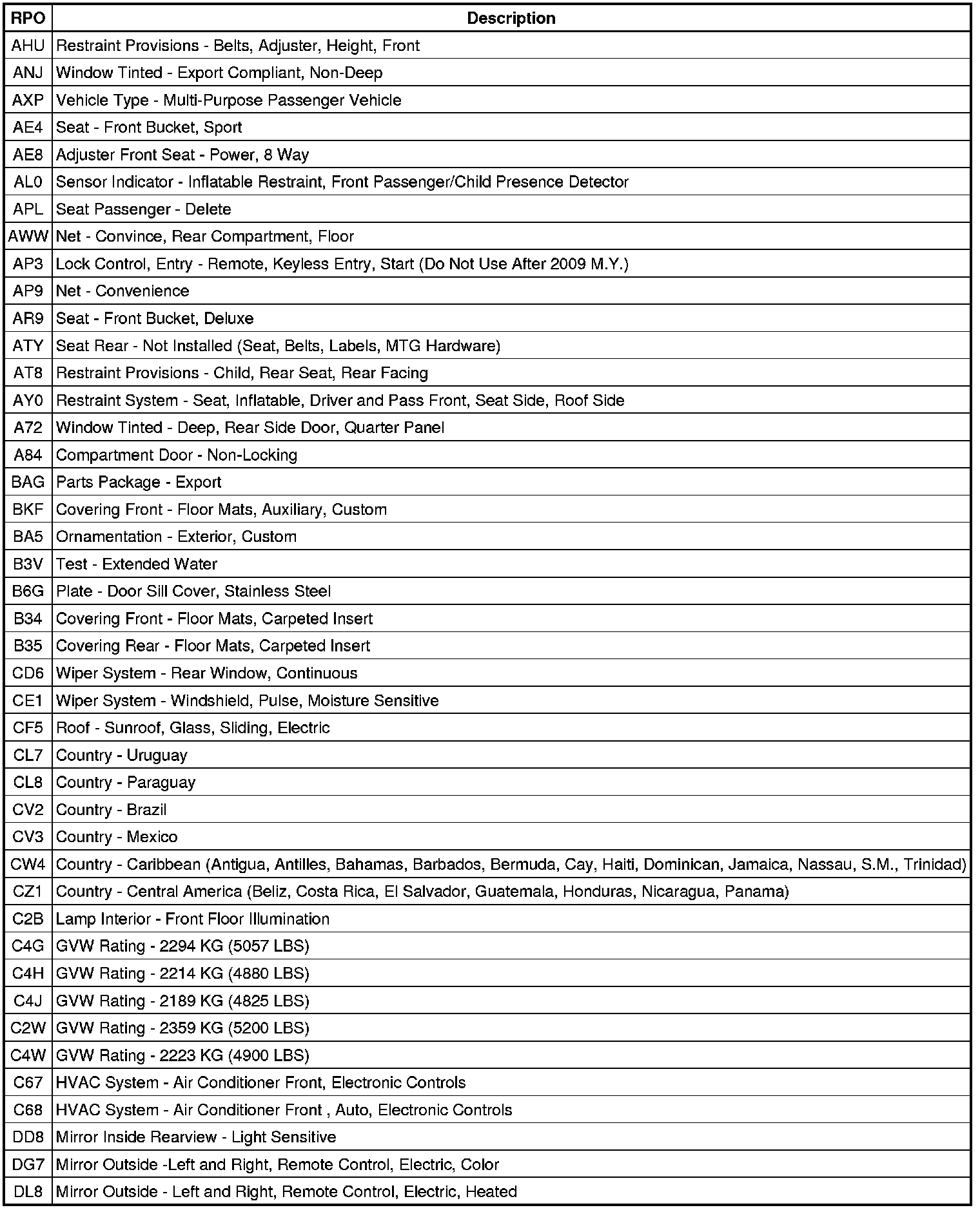 The following table provides the description of the RPO codes that are available on the vehicle. The vehicles RPO list is printed on the Service Parts Identification Label.