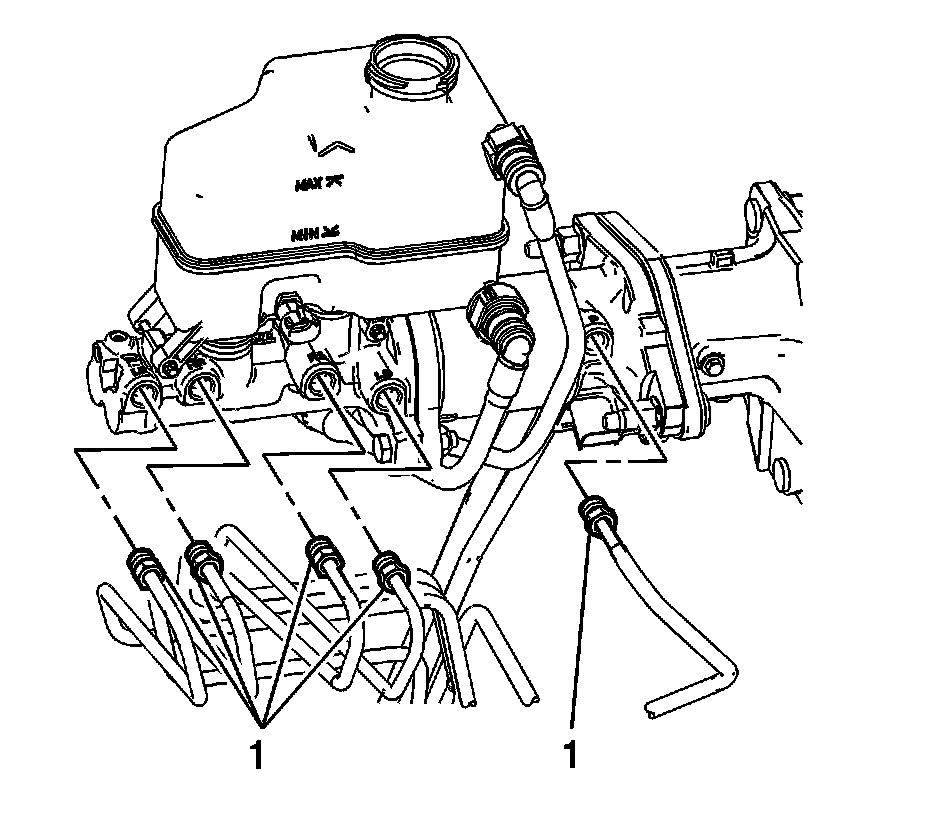 4. Mark the location of the master cylinder brake pipe fittings (1).