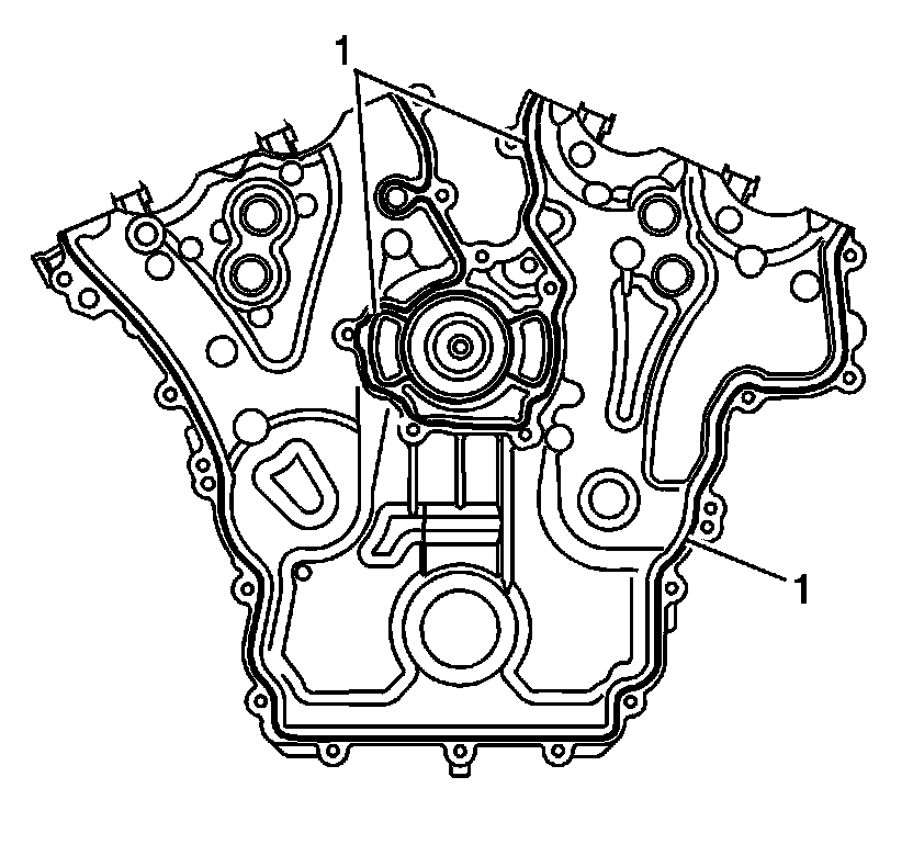 3. Place a 3 mm (0.118 in) bead of RTV sealant, GM P/N 12378521 (Canadian P/N 88901148) or equivalent, on the engine front cover as shown (1).