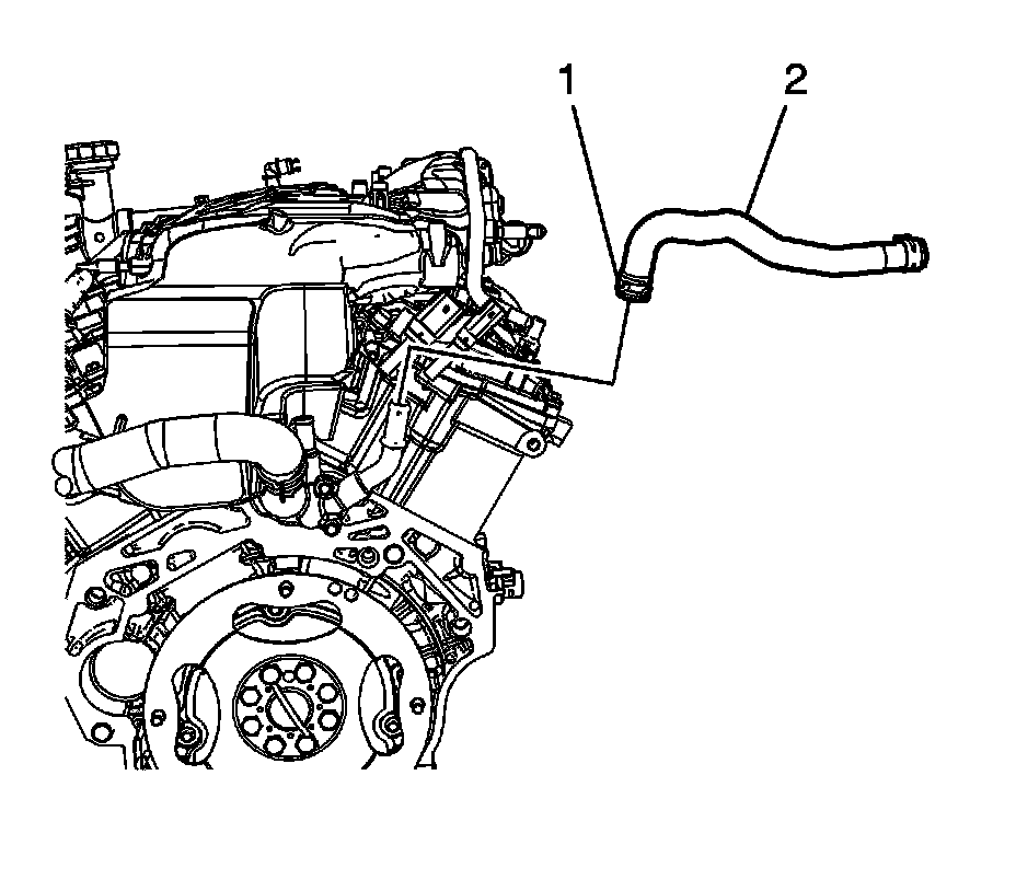 3. Using J 38185 - Hose Clamp Pliers disengage the tension on the hose clamp (1) and remove the heater inlet hose (2) from the thermostat housing.