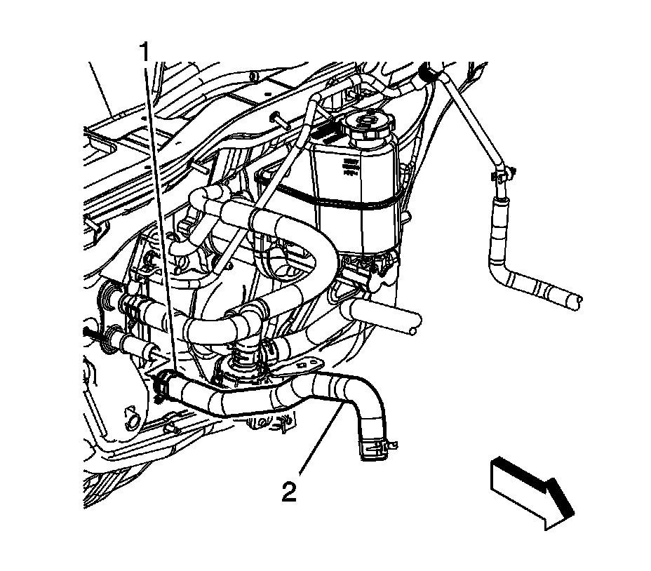 2. Using J 38185 - Hose Clamp Pliers disengage the tension on the hose clamp (1) and install the heater inlet hose (2) to the heater core.