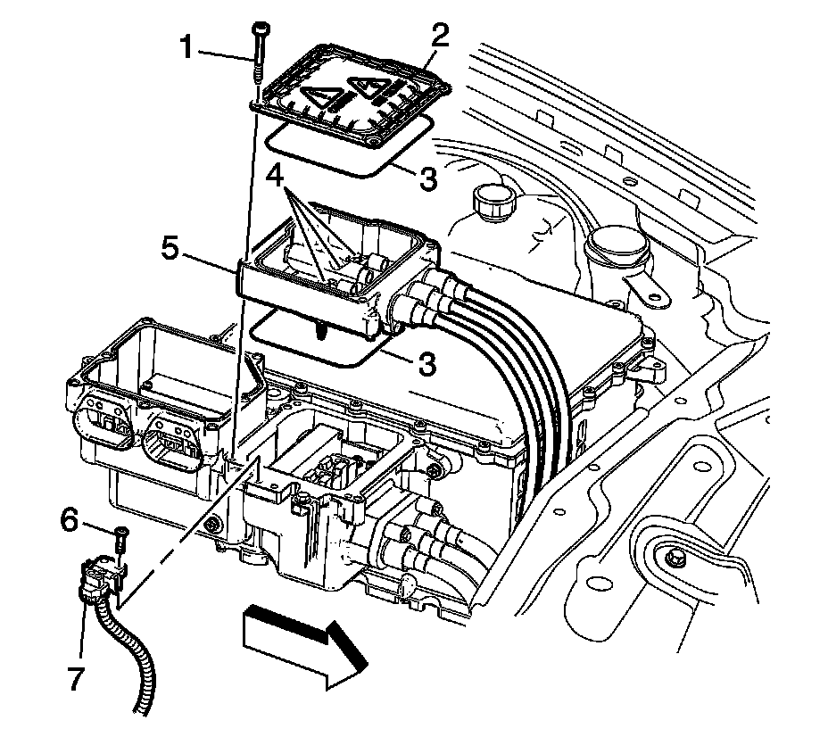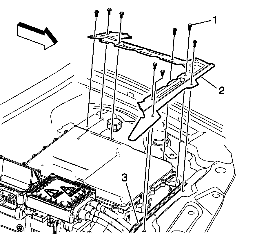 18. Remove the drive motor generator power inverter control module (PIM) 3 phase cable housing cover fasteners (1).