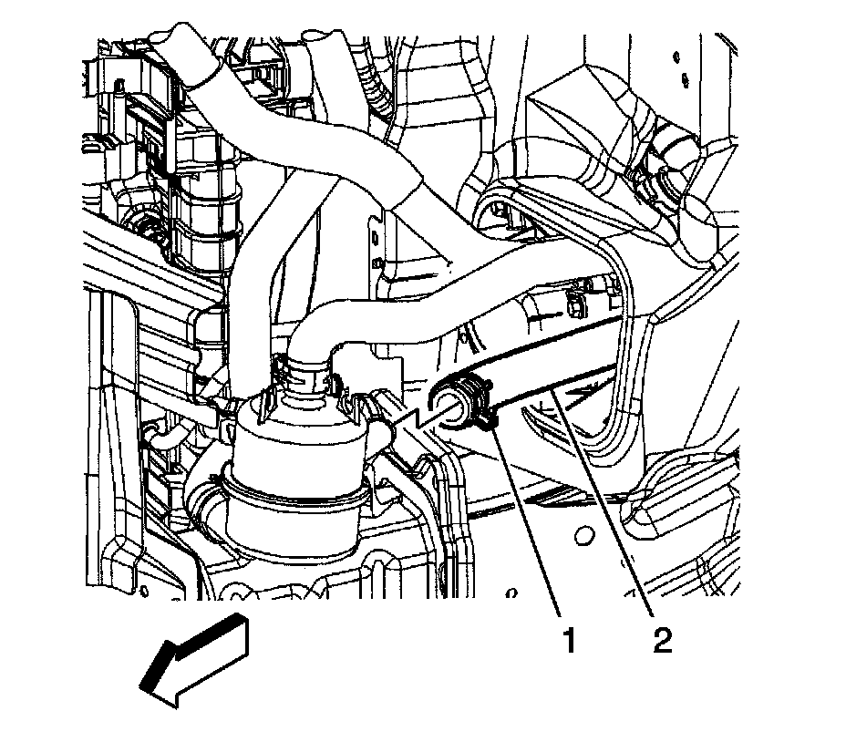 34. Remove the generator control module coolant outlet hose (2) and hose clamp (1) from the radiator surge tank air separator.