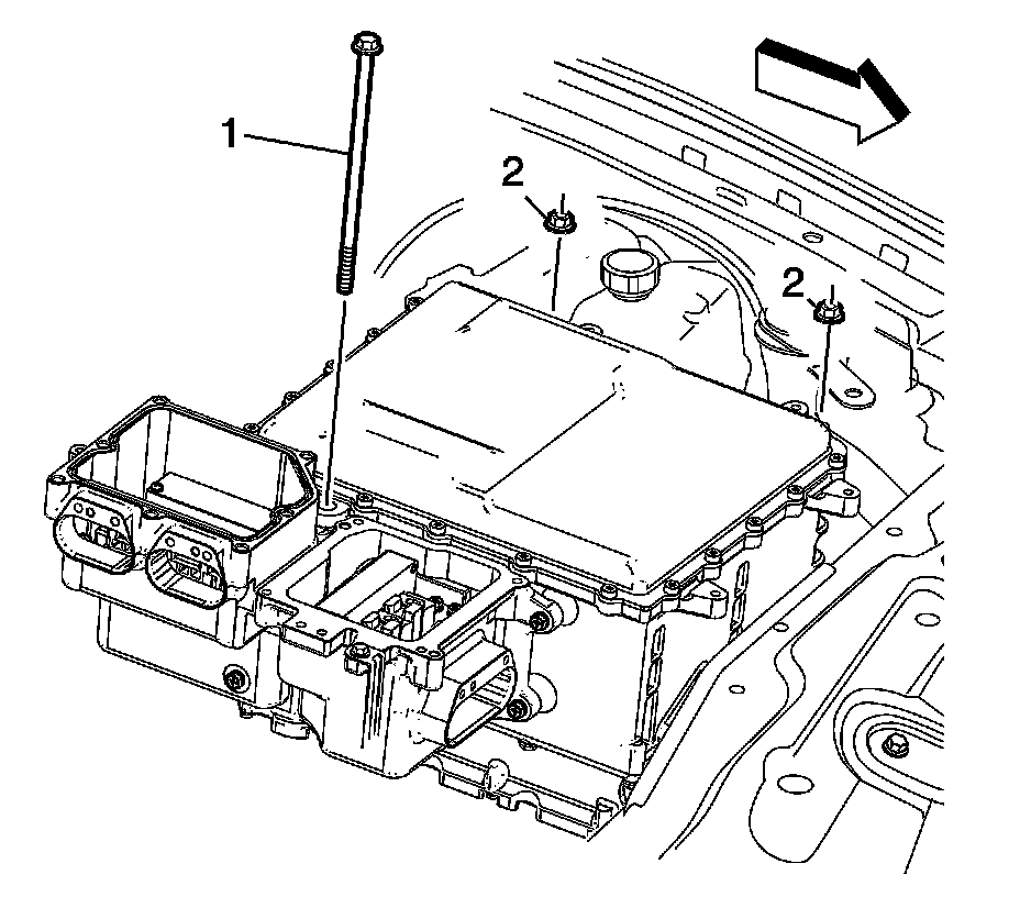Remove the control module assembly mounting retainer bolt (1) and assembly mounting nuts (2).