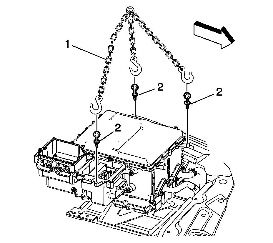 1. Attach a lifting device (1-2) to the drive motor generator control module assembly at the three identified locations.