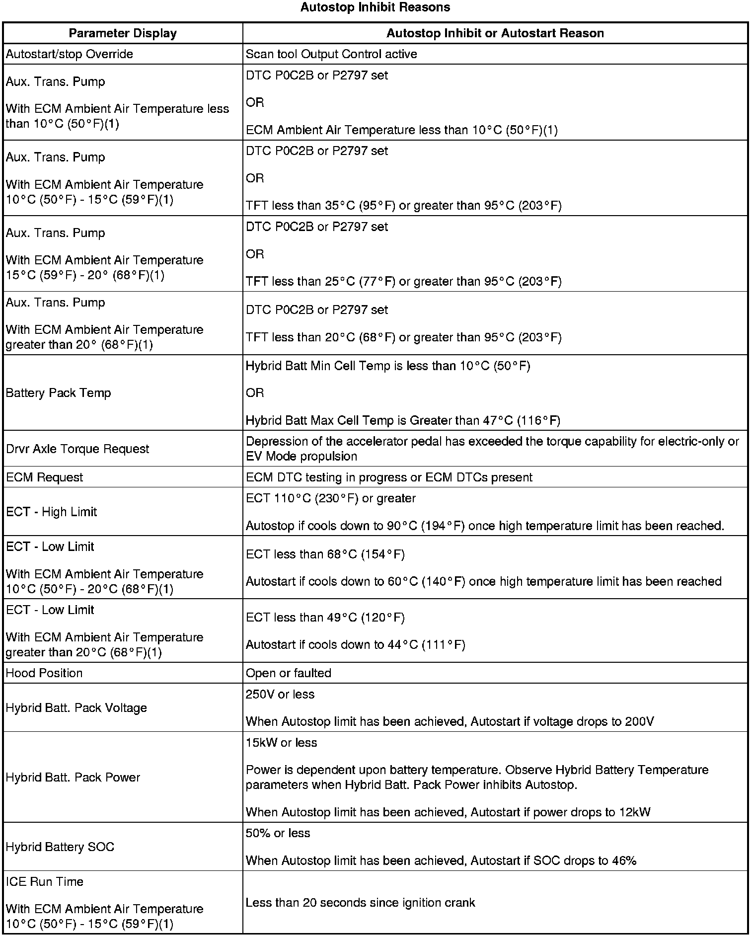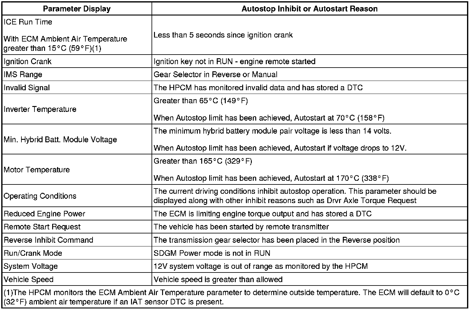 • Advise the vehicle operator of the normal operating and environmental conditions that will inhibit Autostop. For example, advise that Autostop is disabled when hybrid Battery Pack temperature is less than 10°C (50°F).