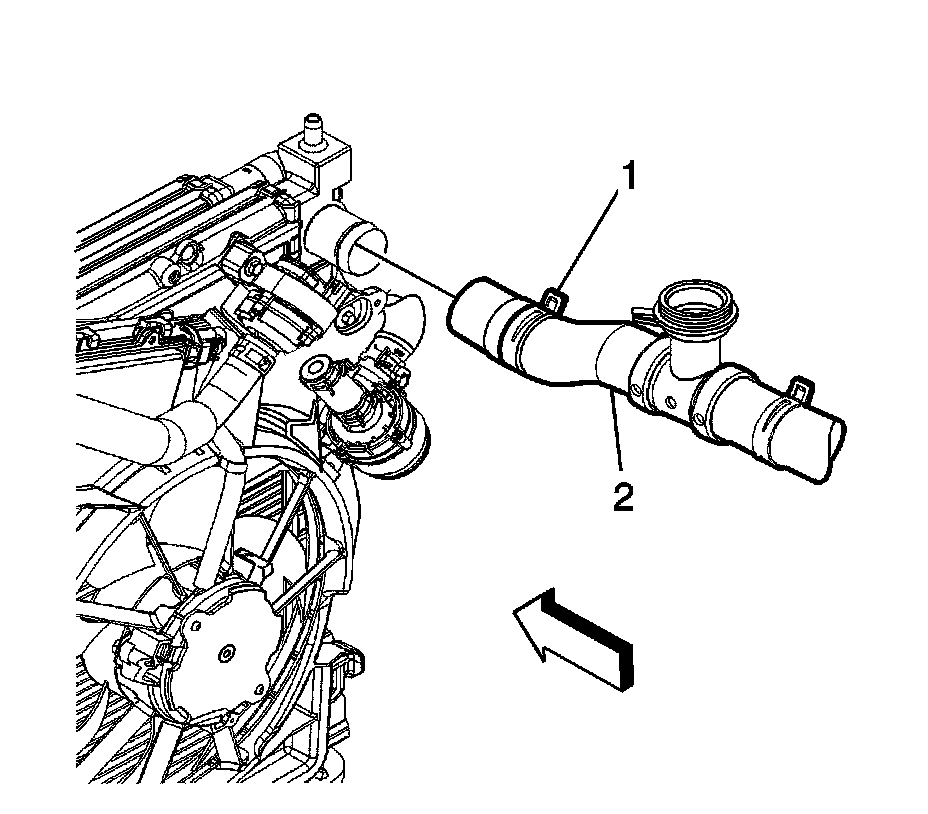 7. Using J 38185 - Hose Clamp Pliers disengage the tension on the hose clamp (1) and remove the radiator inlet hose (2) from the engine.